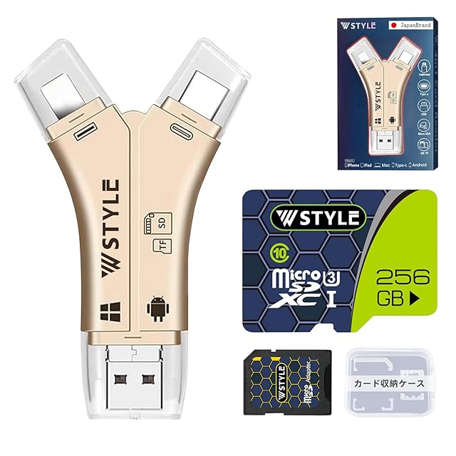 スマホ SD カードリーダー SDカードカメラリーダー microSDカード 256GB 専用アプリ不要で簡単 1TB 対応 iPhone16 USBメモリ 外付け 写真 保存 移動 容量 データ バックアップ 日本語取説付 W STYLE 正規品 (DN063_gold+256GB) | TREND DESIGN 家電専門店