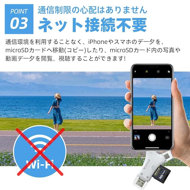 スマホの容量不足を解消するSDカードリーダーなら、大切なデータを簡単に移動可能!お子様の写真や動画もSDカードやPCにスムーズにバックアップでき、ストレージ不足の悩みから解放されます。 PC・タブレット・スマホ間のデータ転送もラクラク。ほぼすべてのデバイスに対応しているので、作業効率がグンとアップします。スマホ同士のデータ移行も、クラウドやLINEの制限を気にせず、Wi-Fi不要で簡単に完了。 Googleフォトの有料化対策としても最適!デジカメやアクションカメラで撮影した動画や写真を、そのままスマホやタブレットで閲覧できます。最大1TBの大容量SDカードに対応しているので、たくさんの思い出をまとめて保存可能です。 操作も驚くほど簡単。面倒なアプリのインストールは不要で、スマホの標準ファイルアプリで直感的に使えます。誰でもすぐに使いこなせる手軽さが魅力です。