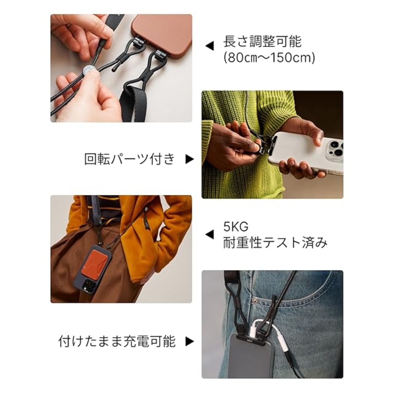 【5kg耐荷重・いつでも豪快に】このスマホショルダーは5kg耐荷重テスト済みです。耐久性のあるナイロン製で、汚れても丸ごと水洗い可能。さらに、不要になったときは、リサイクルに出すことで環境にも貢献できます。