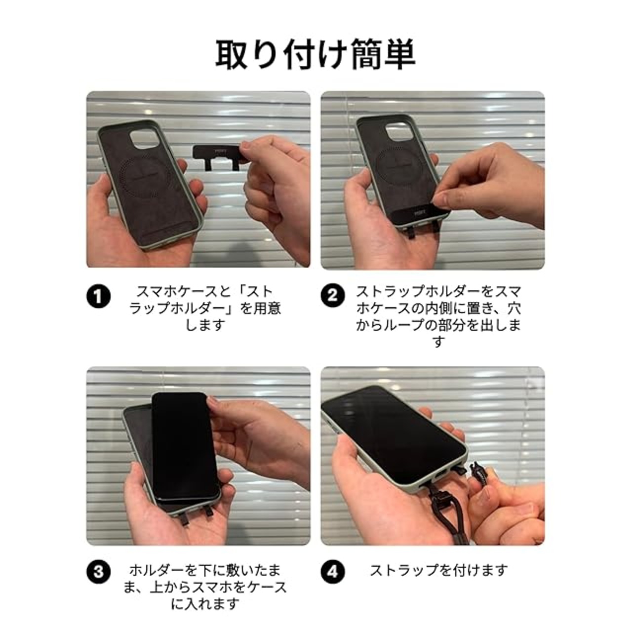 【多機種対応・ケース素材注意】付属のストラップフックをケースに貼り付ければ、機種に限らずどんなスマホもスリング可能。プレゼントの際も相手のスマホ機種を気にする必要がなく安心!*ご注意:貼り付ける場合、対応できるケースの素材は「TPU/PU/ガラス/アルミニウム合金」のみで、表面がゴム/すりガラス/革等のケースにはお使いいただけません。