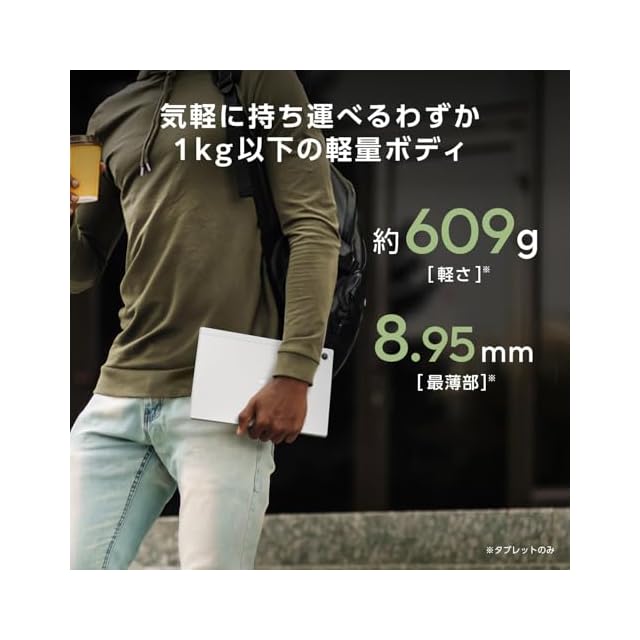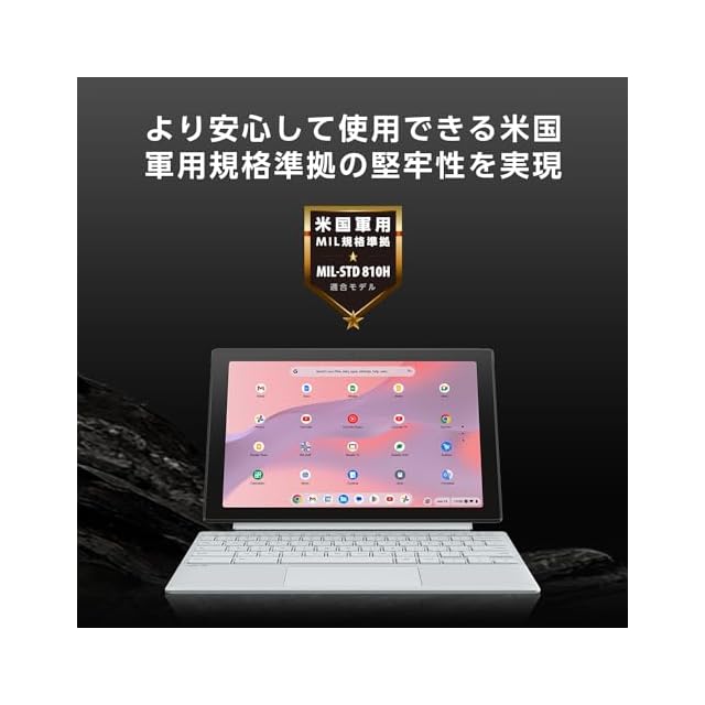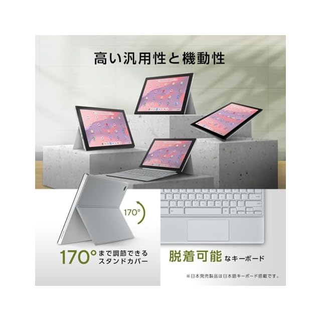 【OS 】Chrome OS【カラー】フォグシルバー【サイズ】本体 : 幅259.5mm×奥行き169.2mm×高さ8.95mm 約609g (本体+キーボード時:高さ14.65mm 約738g, 本体+キーボード+スタンドカバー時:高さ19.6mm 約988g)