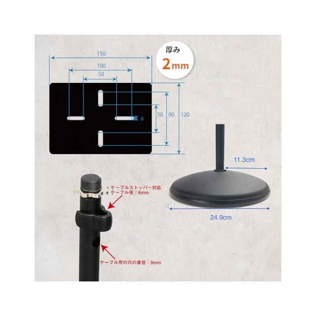 高さ:575mm~1,045mm、台座サイズ:直径250mm、パイプ径:22.5mm / 16mm、重量:2.74Kg/1本