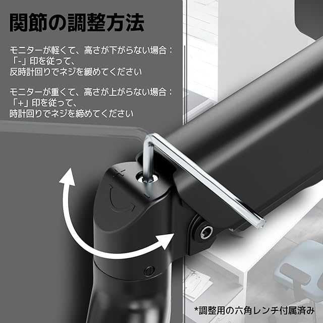 スプリング内蔵:機械スプリングを内蔵し、スムーズで安定した上下調整が可能。スプリングの張力調整も行えます;