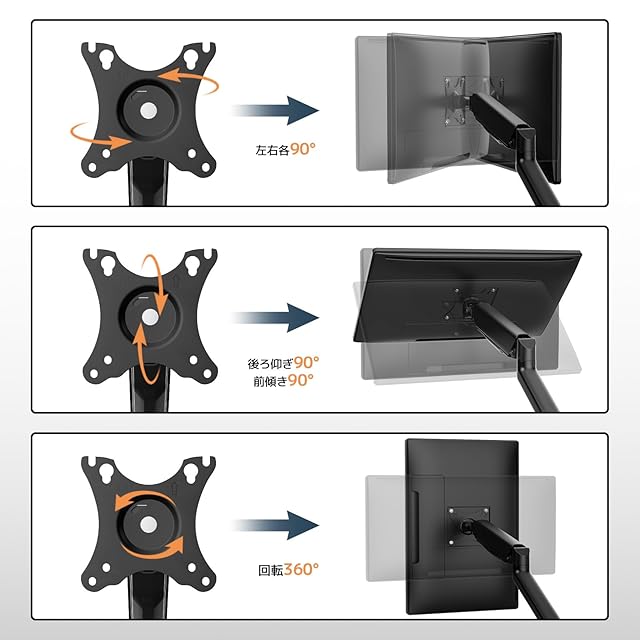 多彩な調整機能:上下90°~-90°、左右90°~-90°、360°回転が可能で、モニターの位置や角度を自由に調整できます。最適な視角で作業可能;