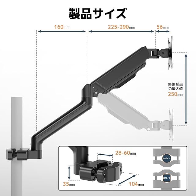 商品名:ACCURTEK モニターアーム ポール・支柱取り付け メカニカル式 スプリング内蔵 上下左右調整 17~32インチ 対応 耐荷重2~9kg VESA75/100 2関節型 取付け簡単 AC32-P12E