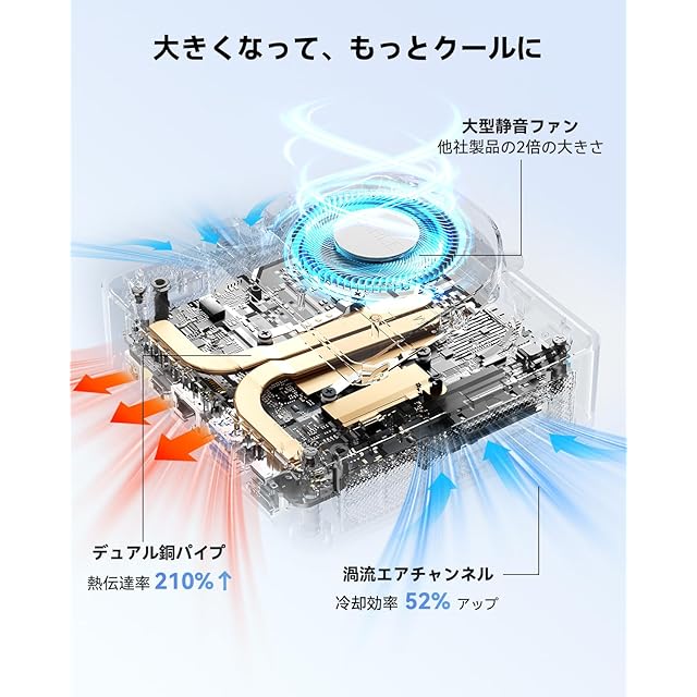 【超静音設計、集中を妨げず】独自開発の最新冷却システム「IceBlast 2.0」搭載:大型ファンで風量アップ。さらに純銅製ヒートシンクモジュールを採用し、大型ヒートパイプで熱伝導効率向上。オフィス作業やエンタメ時もほぼ無音で、図書館のページをめくる音(30dB)よりも静か。一般的なmini PCは小型ファンのため風量不足で、冷却のため高速回転が必要で騒音が大きくなります。