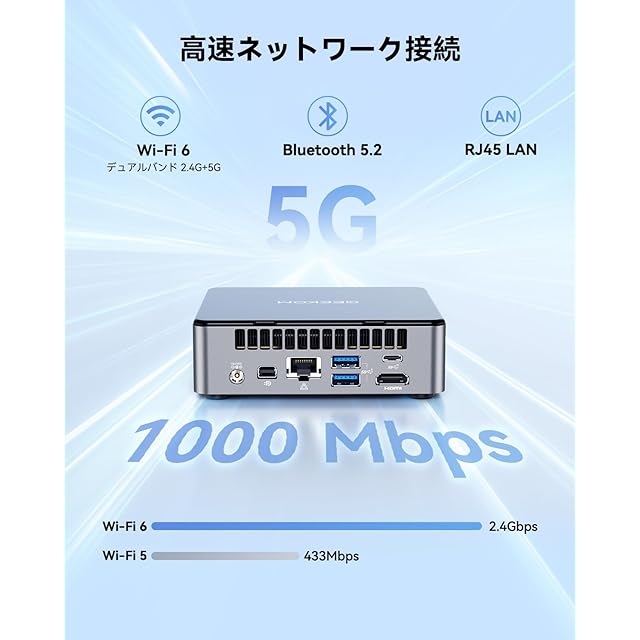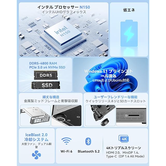 【⚡圧倒的な性能、滑らかな操作体験】最新第12世代Intel Alder Lake-N150プロセッサー(4コア/4スレッド、最大ターボブースト3.6GHz、6MBキャッシュ)を搭載。DDR5-4800MHz高速メモリ(16GB)を採用し、競合のDDR4-3200MHzモデルに比べてメモリ帯域幅が50%以上向上。10以上のブラウザタブ+Office作業+ビデオ会議を同時に快適に動作可能!512GB PCIe NVMe SSD(最大2TBまで拡張可能、読み取り速度3500MB/s)で大容量ストレージも安心です。手のひらサイズの超コンパクトボディでありながら、高性能と大幅な省電力(革新的な6W超低消費電力設計)を両立。"小さな筐体に大容量パワー、高性能かつ低消費電力"という理想的なバランスを実現。常時稼働が必要なオフィス環境や静音性が求められるホームユースに最適な設計です。