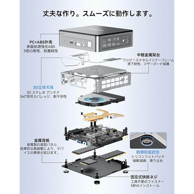 【独自の産業用耐久設計】上面カバー+外枠はPC+ABS素材を使用しており、一般的なプラスチック素材よりも硬度が高く変形しにくい構造です。さらに全金属製の中枠+底面カバーを採用し、200kgの圧力にも耐える変形防止設計で、落下時の衝撃から内部部品を保護します。プロフェッショナルで上質な外観と耐久性を両立した設計。私たちは安価な"プラスチック感"ではなく、5年以上安心して使える信頼性の高いMINI PCを提供します。