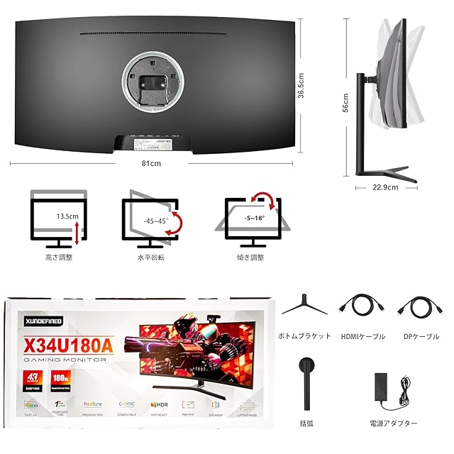 商品名:XUNDEFINED 34インチ湾曲ゲーミングモニター 180Hz/1ms/UWQHD 21:9 曲面 1500R ウルトラワイド モニター/4000:1コントラスト比/126% sRGB/HDR/Adaptive Sync/ブルーライト軽減/フリッカーフリー/高さ&傾斜調整/HDMI2.0×2/DP1.4×2/VESA対応