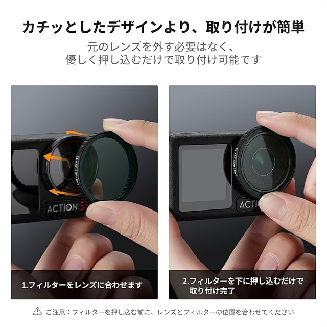 商品名:K&F Concept Osmo Action 5Pro/4/3 用フィルターセット(PL+ND8+ND16+ND32+ND64+ND1000) 【元レンズに直接はめ込むだけで取付可能】NDフィルター 減光フィルター CPLフィルター 偏光フィルター レンズ保護 AGC光学ガラス 高透過率 プロテクトフィルター 減光量調整 反射除去 28層ナノコーティング 撥水防汚 装着簡単