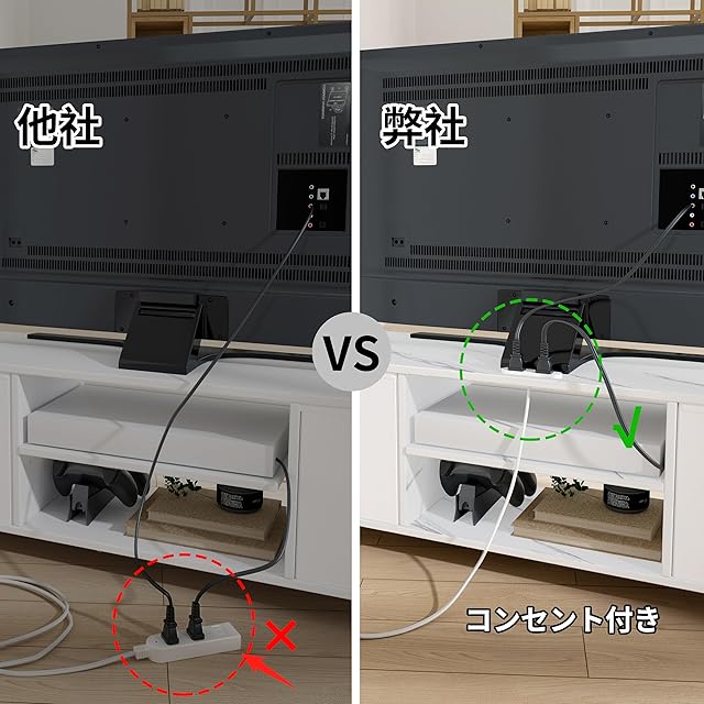 LunarLight テレビ台 本製品はテレビ台としてもローボードとしても活躍する多機能収納家具です。高さを抑えたデザインで圧迫感がなく、お部屋を広く見せる効果があります。左右両側にはたっぷり収納できる引き出しを備え、中央の棚板は3cm間隔で上下3段階に調整可能。収納する物の高さに合わせて自由にレイアウトできます。 天板には便利な2口コンセント付きで、テレビや周辺機器の電源確保もスムーズ。下部にはストッパー付きキャスターを搭載しており、移動やお掃除も簡単です。さらに、組み立てもシンプルで、女性一人でも安心して作業可能。 耐荷重は100kgと頑丈な構造で、安心してテレビやオーディオ機器を設置できます。シンプルでスタイリッシュなデザインは、和風・洋風を問わずあらゆるインテリアにマッチ。玄関や寝室、リビングなど、様々な空間で使いやすい万能テレビ台です。