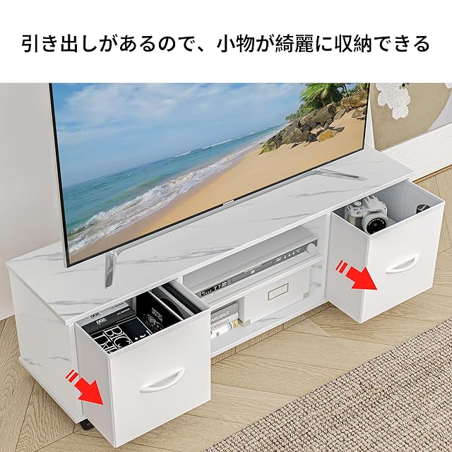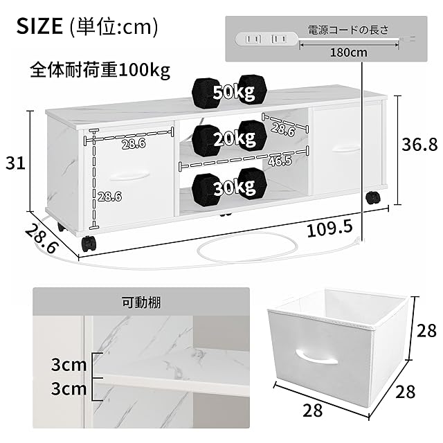 商品名:LunarLight テレビ台 幅109.5奥行28.6高さ36.8cm テレビボード ローボード コンセント付き 布製引き出し付き 多機能収納ボックス 収納棚板調整可能 32型 42型 55型テレビ適合 収納 組立簡単 工具不要 耐震転倒防止 耐荷重100kg (大理石調ホワイト)