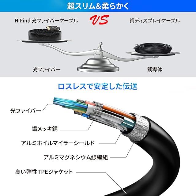 【超薄型で柔軟】光ファイバーディスプレイポートケーブルは非常に薄くて柔軟性があり、外径=4.7MMです。 チップがコネクタ内にあるため、ディスプレイ ポートコネクタを強く引っ張らないでください。 Displayport 光ファイバー導体は光信号ファイバーと OFC ワイヤーの混合物から作られており、ケーブル自体を強く引っ張ることはありません。