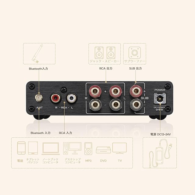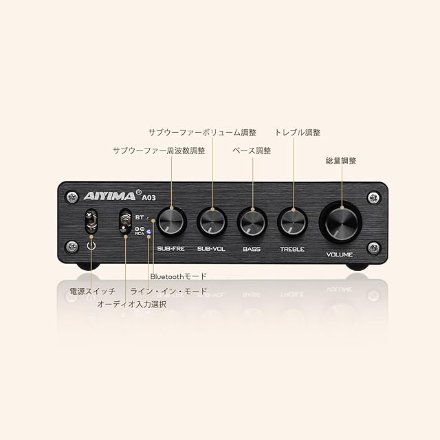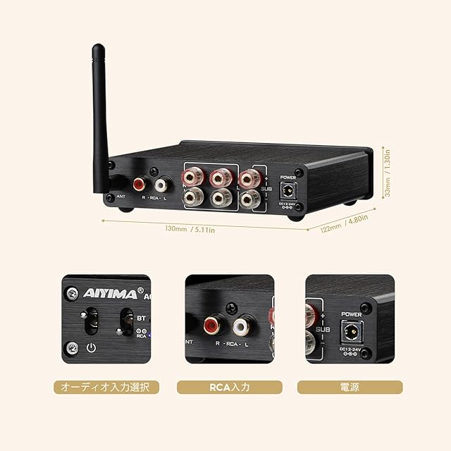 商品名:AIYIMA A03 TPA3116サブウーファーアンプ QCC304X Bluetooth 5.2 HiFi TPA3116D2 2.1チャンネルデジタルオーディオアンプ50W * 2 + 100W サポートAAC、SBC、aptX、aptX-LL、APTX-HD 音量調整機能付き24v 電源アダプター