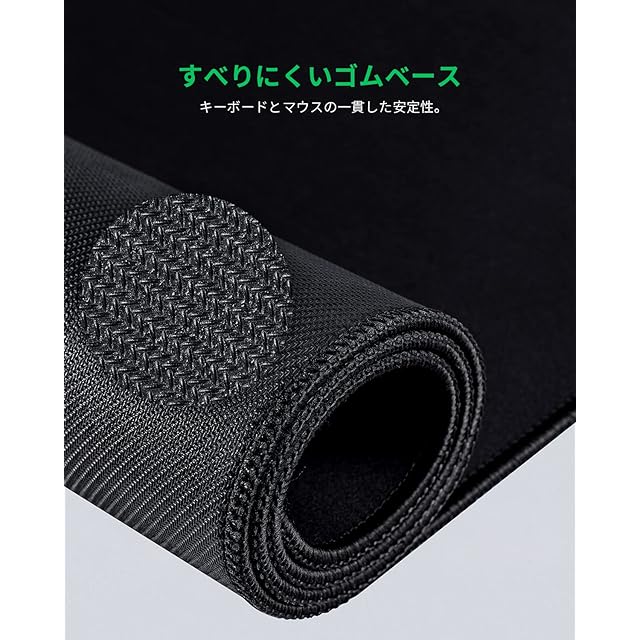 【なめらかな表面とすべりにくいベース】 デスクマットには柔らかい布の表面とすべり止めのゴム製ベースを採用。卓上にしっかりと固定されるので、ゲーミングマウスをマウスパッド上で正確かつ簡単にスライドできます。