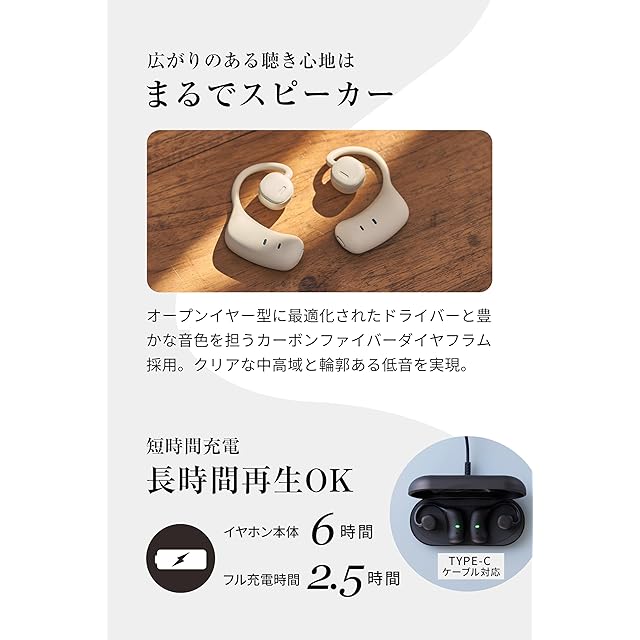 イヤホンなのに、まるでスピーカー 空間を感じるプレミアムサウンド|オープンイヤー型に最適化された直径12mmのドライバー。豊かな音色を担うカーボンファイバーダイヤフラム採用し、クリアな中高域、輪郭ある低音と、空間の広がりを感じるプレミアムサウンドを実現。