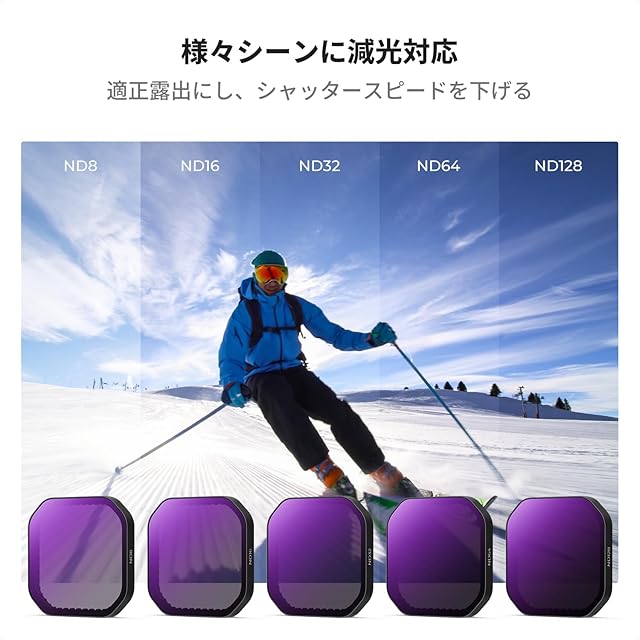 【多機能フィルターセット】PLフィルターに加え、ND8、ND16、ND32、ND64、ND128の5種類の減光フィルターが含まれており、様々な明るさの条件に対応。多様な撮影シーンでの効果的な減光が可能です。