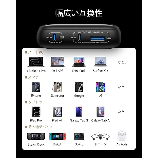 【三台同時充電】驚きの速さのPD 65W USB-C出力ポート、急速充電可能のPD 36W USB-C出力ポート、信頼できるUSB-Aポートを含む3つの充電ポートを備えたこのモバイル・バッテリーは、あなたのオールインワンチョイスです。様々なケーブルにシームレスに対応し、数多くのデバイスの急速充電を実現できます。
