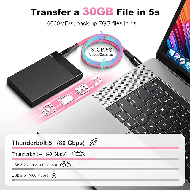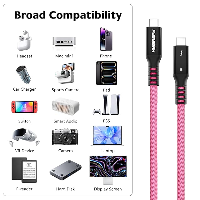 HYairspy Thunderbolt 5 USB-Cケーブル 80Gbps 240W 急速充電 | 3.3フィート/6.6フィート | 5色 (ブラック/ホワイト/オレンジ/ピンク/マルチカラー) | インテル認証 デュアル8K@144Hz、USB4、Mac、iPhone 16、ゲーム、SSD対応 ⚡ 【240W超高速充電 – PD3.1& QC4.0 】インテリジェントな温度制御により、iPhone 16/15シリーズ、MacBook Pro、Samsung Galaxy S25/S24、高出力ノートパソコンを安全に充電できます。 過熱のリスクを防ぎながら、最大240Wの高速充電(実際の速度はデバイスによって異なります)を提供します。 【80Gbps Thunderbolt 5 データ転送 – インテル認定】クリエイターやゲーマー向けの#1 Thunderbolt 5ケーブル。 4Kムービーを数秒で転送し、デュアル8K@120Hzモニター、eGPUドック、外付けSSDドライブ、マルチスクリーンワークステーションに電力を供給します。 USB4/Thunderbolt 4/3の完全な下位互換性。 ✅【スタイリッシュな5色&2つの長さ – デスクトップまたは外出先でも】3.3フィート(デスクトップ/ポータブル)または6.6フィート(ワークスペース/VRゲーム)のセットアップにマッチします。 洗練されたブラック、ミニマリストホワイト、鮮やかなオレンジ、ソフトピンク、トレンディなマルチカラー編組ケーブルからお選びください。 【ユニバーサルUSB-C対応】Mac Studio/Mini M2/M3、iPad Pro 2024、Windows PC、Google Pixel 9/8、LG UltraFineディスプレイ、ASUS/HP/Dell Thunderboltドック、USB-Cパワーバンクと完璧に動作します。 [工業グレードの耐久性 - 30,000回以上の曲げ寿命] 強化された二重編組ナイロンと錫メッキ銅コアは、標準的なケーブルよりも200%高い張力に耐えます。 30,000回以上の曲げテストに耐えます - 旅行、ゲームリグ、毎日の過酷な使用に最適です。 ✅ HYairspy Thunderbolt 5ケーブルを選ぶ理由。 Intel Thunderbolt 5認定 (本物の80Gbpsの速度を) 240W充電 + 8Kデュアルディスプレイ対応 5色のオプションでテクノロジーエコシステムをパーソナライズ 3.3フィート&6.6フィート – あらゆるワークスペースに最適化 – 今すぐセットアップをアップグレード – 1本のケーブルでパワー、スピード、スタイルを!