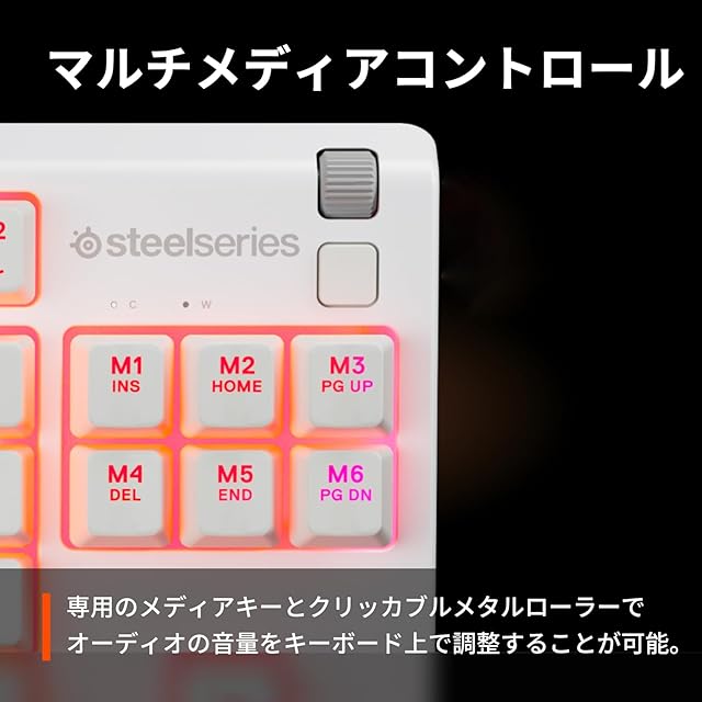 【マルチメディアコントロール付き】専用のメディアキーとクリッカブルメタルローラーで、オーディオの音量をキーボード上で調整することが可能です。