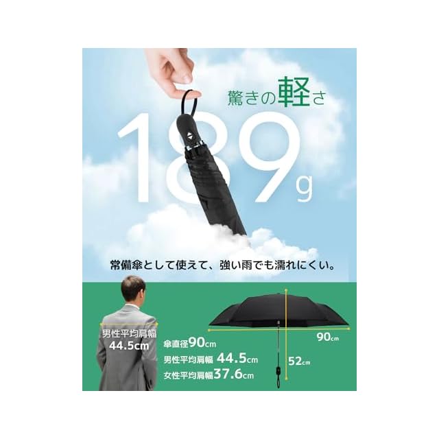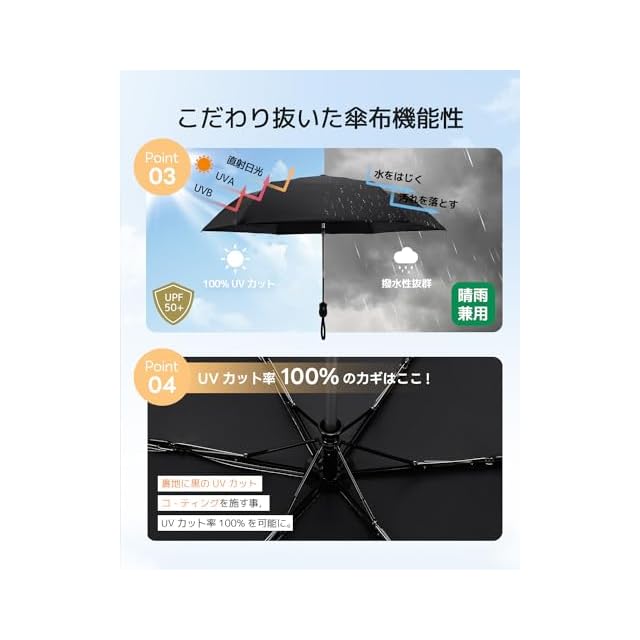 【晴雨兼用*耐風撥水】310T高密度の撥水加工材料で作られ、雨が珠のように丸くなり転がり落ちます。普通の傘より撥水性が優れ、軽く振るだけで雨水を振り払えます。長い間使用しても雨の染み込みが気にならなくなりました。電車内等の公共の場では人にご迷惑を掛けません。また防汚効果もあり、汚れにも強い生地です。中棒は頑丈航空機用アルミ合金製造、6本の傘骨にグラスファイバーと航空機用アルミ合金を使用しました。耐久性に優れています。強風で裏返っても元に戻ります。