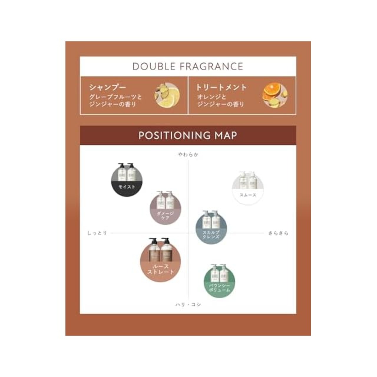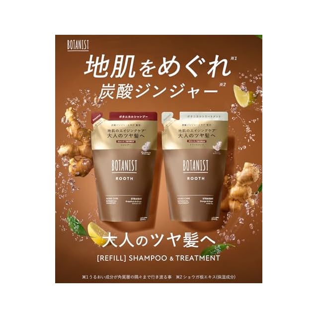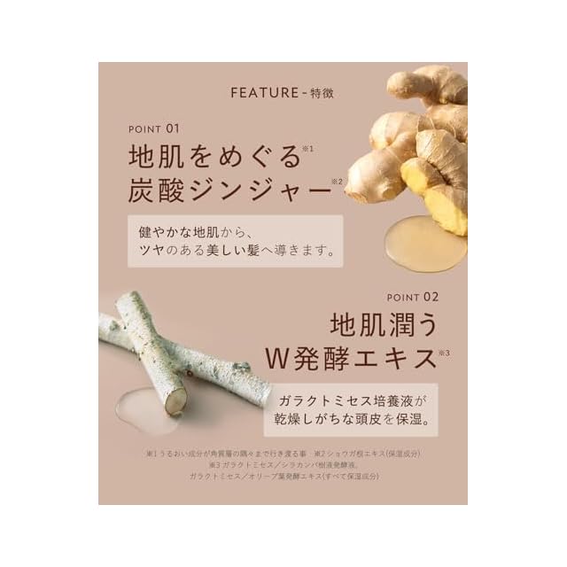 【シャンプー】「炭酸ジンジャー※1が地肌をめぐる※2 根元ふんわり、まとまりのあるツヤ髪へ」 フレッシュで温かみのあるグレープフルーツとジンジャーの香り ストレート/うねり抑える※3 地肌がスッとする使用感 [シリコン・パラベン・合成着色料・サルフェート※4フリー] ➀ 炭酸ジンジャーエキス※1配合 └健やかな地肌から、髪本来の美しさを呼び覚ます ② W発酵成分※5配合 └スキンケアで注目のガラクトミセス(酵母)で発酵させた2種の成分で、エイジングにより乾燥しがちな頭皮を保湿します。 ③環境に優しい 詰替パウチ ・環境に優しい再生プラスチック使用で石油由来原料を削減 ・本体容器よりも廃棄プラスチックを約82%削減できます ※1 ショウガ根エキス(保湿成分) ※2 うるおい成分が角質層の隅々まで行き渡る事 ※3 髪に水分を補う事による ※4 硫酸系界面活性剤 ※5 ガラクトミセス/シラカンバ樹液発酵液、ガラクトミセス/オリーブ葉発酵エキス(すべて保湿成分) 【トリートメント】 「炭酸ジンジャー※1が地肌をめぐる※2 根元ふんわり、まとまりのあるツヤ髪へ」 みずみずしく温かみのあるオレンジとジンジャーの香り ストレート/うねり抑える※3 [シリコン・パラベン・合成着色料フリー] ➀ 炭酸ジンジャーエキス※1配合 └健やかな地肌から、髪本来の美しさを呼び覚ます ② W発酵成分※4配合 └スキンケアで注目のガラクトミセス(酵母)で発酵させた2種の成分で、エイジングにより乾燥しがちな頭皮を保湿します。 ③ 地肌に直接つけることができるトリートメント(継承) └頭皮に有用成分を浸透※5 ④環境に優しい 詰替パウチ ・環境に優しい再生プラスチック使用で石油由来原料を削減 ・本体容器よりも廃棄プラスチックを約82%削減できます ※1 ショウガ根エキス(保湿成分) ※2 うるおい成分が角質層の隅々まで行き渡る事 ※3 髪に水分を補う事による ※4 ガラクトミセス/シラカンバ樹液発酵液、ガラクトミセス/オリーブ葉発酵エキス(すべて保湿成分) ※5 角質層まで
