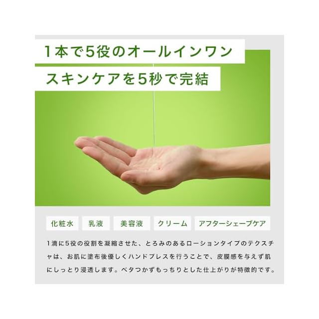 【1本に5役を集約したオールインワンスキンケアアイテム】この1本に化粧水・美容液・乳液・パック・アフターシェービングケアを集約しました。