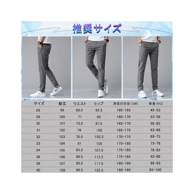 【28】身長:160-165cm 体重:45-53kg【29】身長:160-170cm 体重:53-58kg【30】身長:165-170cm 体重:58-63kg【31】身長:165-175cm 体重:63-68kg【32】身長:170-175cm 体重:68-73kg【33】身長:175-180cm 体重:73-78kg【34】身長:175-185cm 体重:78-83kg【36】身長:175-185cm 体重:83-88kg【38】身長:180-190cm 体重:88-93kg【40】身長:180-190cm 体重:93-100kg