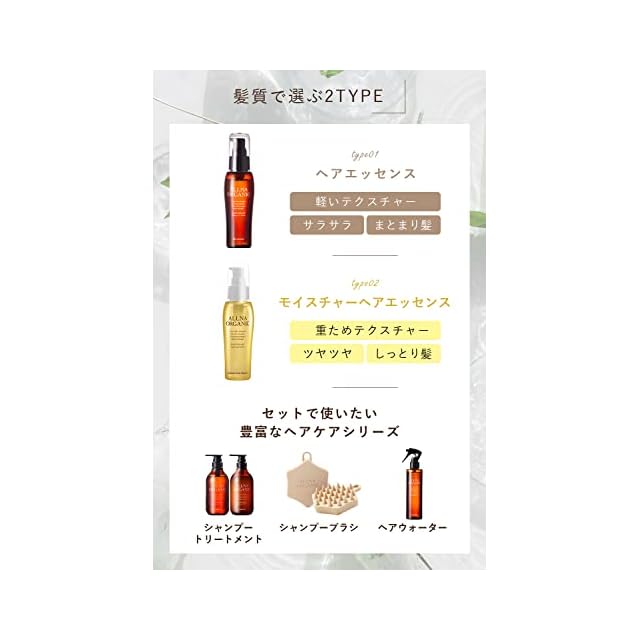 ✨【思わず振り返るサラ艶髪へ】植物オイル(全て 保湿 成分)が髪に素早く浸透し、潤いを与え、艶の溢れる髪へ導く。✨【 保湿 × ダメージケア 】ブラッシング・睡眠時の摩擦やヘアアイロン・ドライヤーなどの熱から髪を守るヒートプロテクト処方。✨【 ヘア美容液 】乾燥から守り摩擦を抑えることで髪をケアし、なめらかな艶髪に導きます。広がる髪をまとめて スタイリング にもgoodな ヘアオイル !✨【スムースタイプ - Brownボトル】~ ふんわりナチュラル ~ ベタつかずサラサラな指通りへ ☆植物アロマの爽やかな香り☆✨【モイスチャータイプ - Yellowボトル】~ しっとりまとまる ~ 髪の乾燥が気になり、しっとり潤したい方に ☆フレッシュシトラスミックスの香り☆