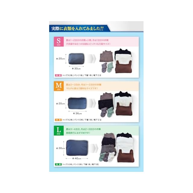 ✅【こんなシーンで活躍】 旅行に。 荷物を最小限に抑えたい出張などに。 着替えを用意しておきたいキャンプに。 クローゼットで使用頻度の低い衣類の収納にも。ちょっとしたお出かけにも必須の一品。