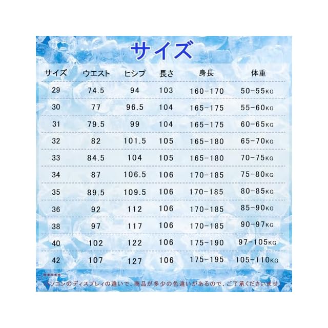 【SIZE:29】身長:160-170cm 体重:50-55kg【SIZE:30】身長:165-175cm 体重:55-60kg【SIZE:31】身長:165-175cm 体重:60-65kg【SIZE:32】身長:165-180cm 体重:65-70kg【SIZE:33】身長:165-180cm 体重:70-75kg 【SIZE:34】身長:170-185cm 体重:75-80kg【SIZE:35】身長:170-185cm 体重:80-85kg【SIZE:36】身長:170-185cm 体重:85-90kg【SIZE:38】身長:170-185cm 体重:90-97kg【SIZE:40】身長:175-190cm 体重:97-105kg 【SIZE:42】身長:175-195cm 体重:105-110kg