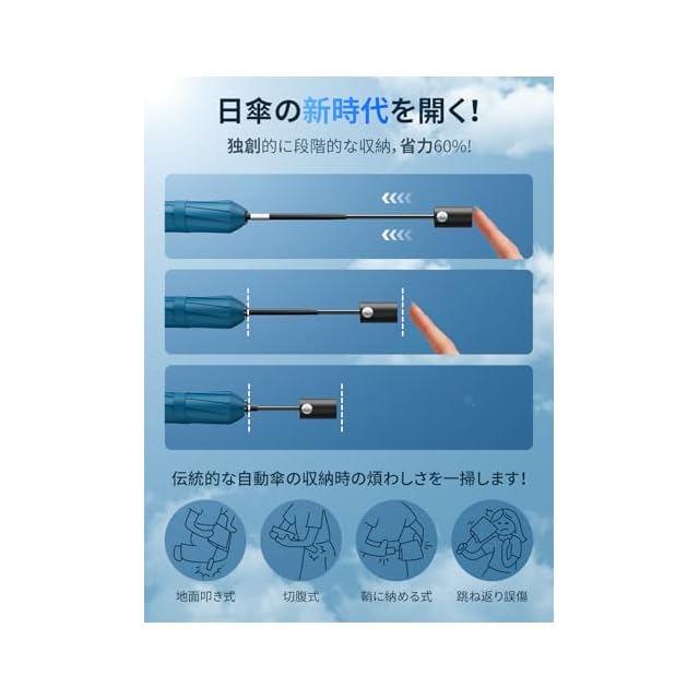【業界初!進化型ワンタッチ自動開閉】新生チーム『日傘』が再び業界を震撼させる!UPEB独自の安全式段階収納自動おりたたみ傘は、反発を防ぎながら段階的に収納し、省力 60% となっており、小学 1 年生のお子様でも簡単に操作できます。伝統的な自動傘の収納時の面倒さ(地面に叩く方法、切腹式収納、鞘に入れる方式、跳ね返りによる誤傷など)を一掃します!」