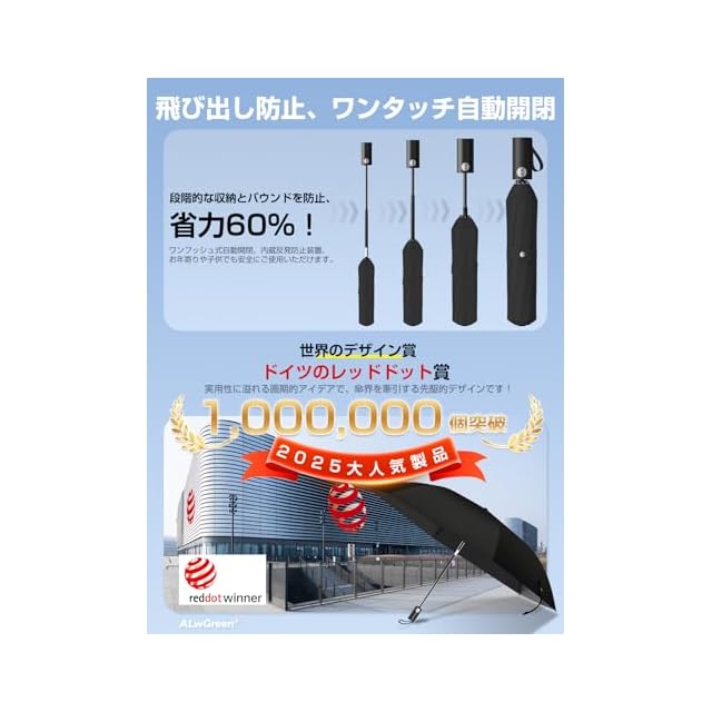 【一歩先行く!業界初安全式自動開閉】傘を閉じるのが難しい、またはちょっとした不注意で反発してしまうことがありますか?…新世代のALwgreenワンタッチ自動開閉折りたたみ傘がこれらの問題を全て解決しました。ALwgreen独自の安全式段階収納自動傘は、反発を防ぎながら段階的に収納し、省力60%!小学1年生のお子様でも簡単に扱えます。10万回の開閉テストをクリアし、耐久性を大幅に向上させ、最長10年間ご使用いただけます。