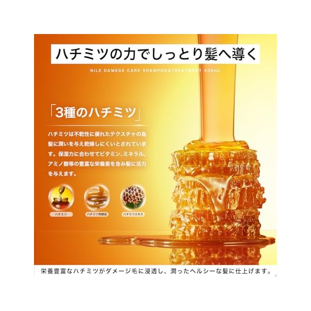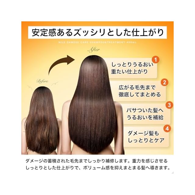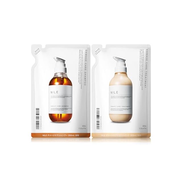 【洗浄しながらダメージケアサポート】アミノ酸活性剤とノンシリコン処方を採用したダメージケアシャンプーは頭皮洗浄とダメージ補修を行いながら頭皮・髪を整えるサポートをします。 【しっとりとした髪へダメージ補修】こってりとしたコンディショナーでダメージ補修をサポートししっとりとした髪へと仕上げます。 【使用方法】ぬるま湯(36~38度)で予洗いを行い、NILEダメージケアシャンプーを2プッシュを目安にご使用ください。髪の長さ、量、スタイリング剤で泡立ちに個人差が出るため、物足りない場合0.5プッシュずつ段階的に追加することをおすすめいたします。指の腹で頭皮を揉み込むような感覚で洗浄し、よく洗い流してください。ダメージケアのためしっとりとした洗い上がりですが、頭皮に影響はございませんのでご安心ください。洗い流した後は、髪の水気を軽く落とし、NILEダメージケアトリートメントを3~4プッシュを目安に取り出しご使用ください。物足りない場合は、次回使用時に1プッシュずつ段階的に追加することをおすすめいたします。全体になじませた後3分程度放置し、頭皮から毛先にかけて洗い流してください。