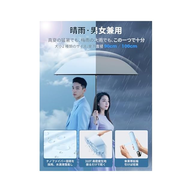 【大小2 種類のサイズ、傘下直径 90cm/100cm・9 色から選べます】90cm の小サイズは軽量で持ち運びが簡単で、いつでもどこでも風や雨を遮ってくれます。日常の通勤や買い物の際に、最適なお供となります。100cm の大サイズは、適切な遮蔽面積で、全方位の保護を提供します。突然の激しい雨でも、心配することはありません 。人それぞれユニークな個性とスタイルを持っています。UPEB が丹念にデザインした 9 色は、服との相性が良いだけでなく、それぞれ鮮明で特徴的です。傘を差して歩くすべての瞬間に、あなたが独一無二の風景になれます 。