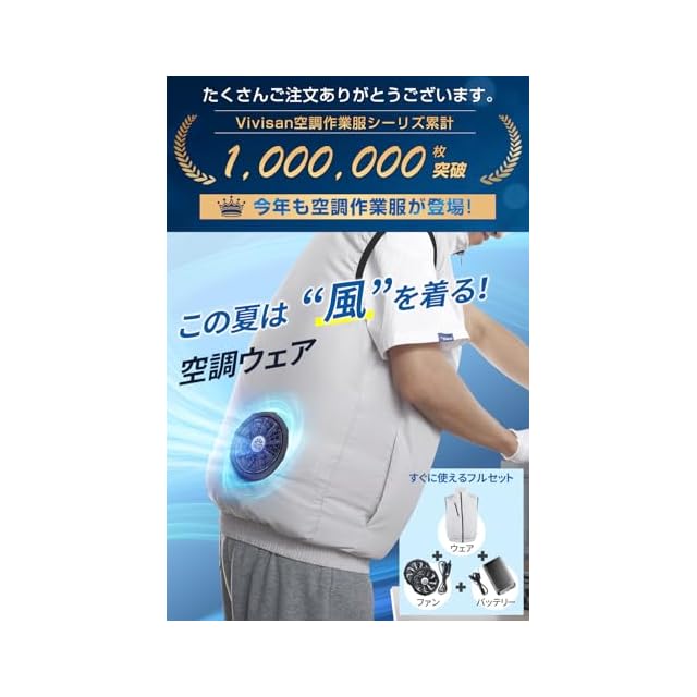 商品名:[Vivisan] 【2025革新 超軽量 · 薄型】 空調作業服 ベスト ファン付きベスト ファンバッテリーセット 35800mAh大容量 ファン付き作業服 冷却服 袖なし 空調ウェア 大風量 3段階風量調節 通気 UVカット 男女兼用 熱中症対策 (JP, アルファベット, L, グレー(無地))