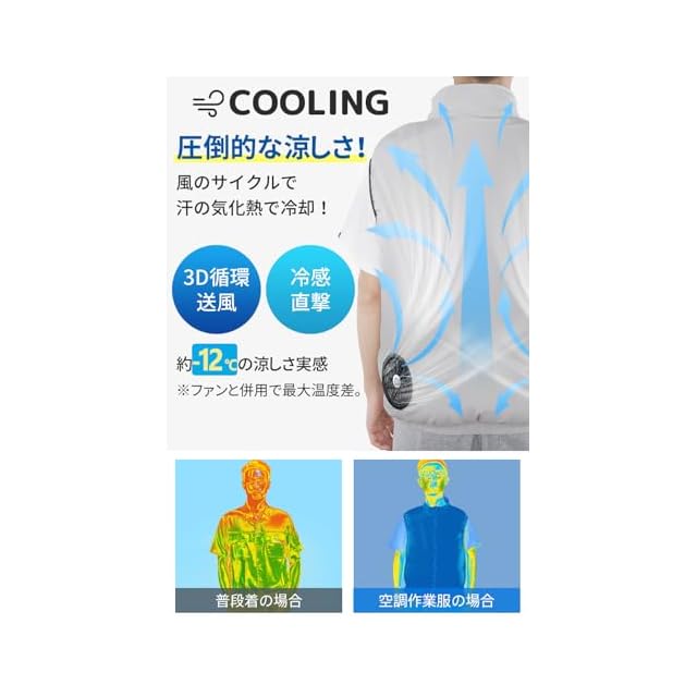 【 ファン付きベスト & 暑い時期も涼しく過ごせる】左右の腰の辺りに取り付け2基のファンにより、服内に外気を取り込み、身体から出る汗を効率よく気化させ、全身を涼しく保ってくれる冷却 ベストです。真夏のべたつく汗、焼けつくような日差し対策として活躍します。また、涼しい送風のほか、UVカット加工で日焼け対策にもパッチリ!夏用 に向いている冷却服です。