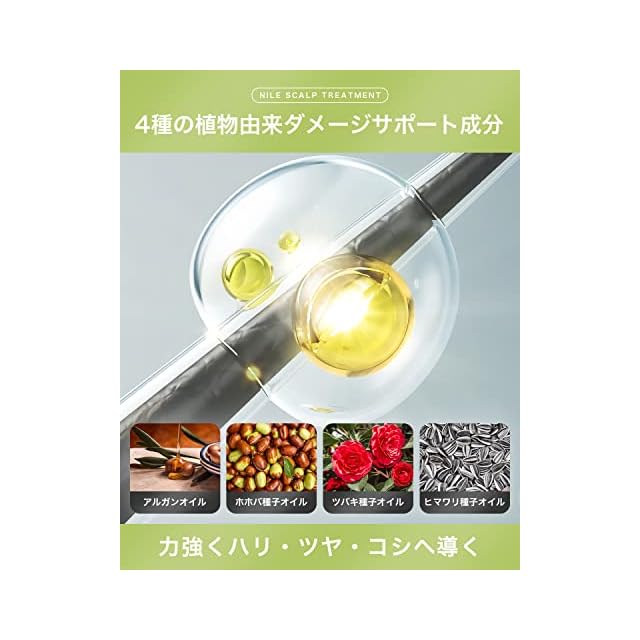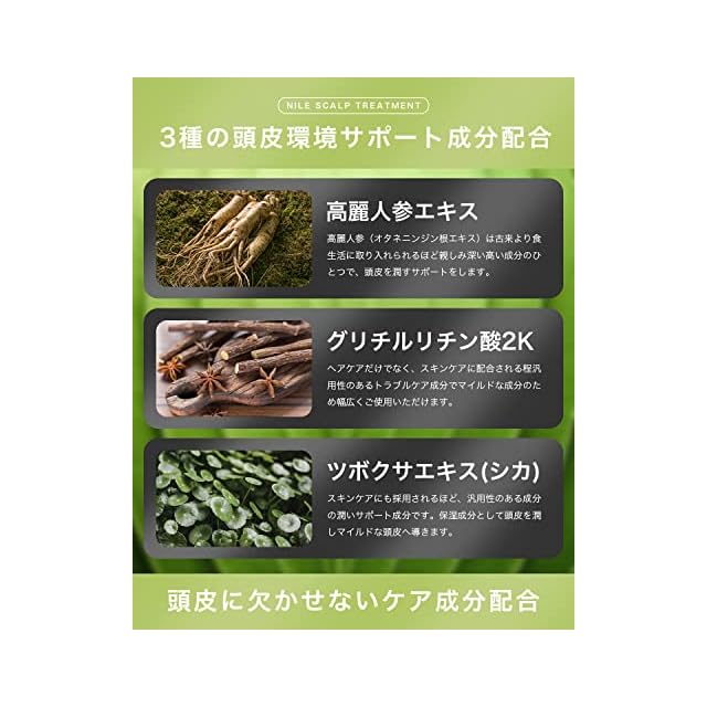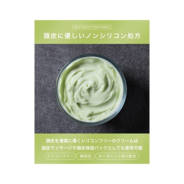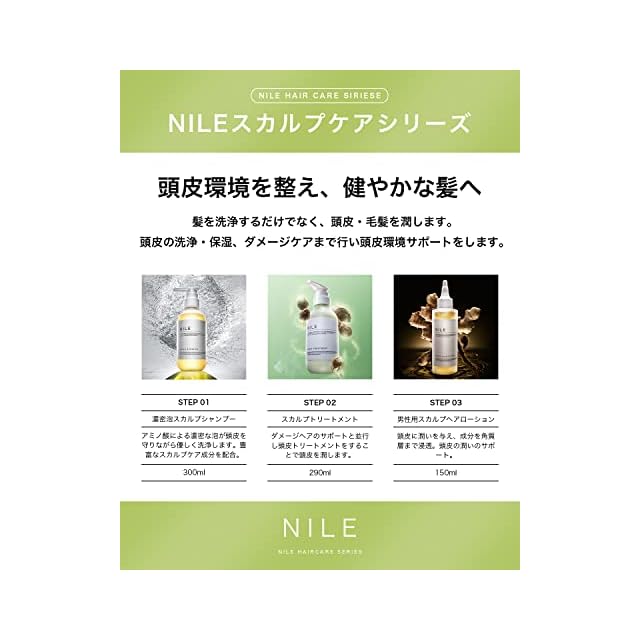 【頭皮へ直接塗りこみ活力頭皮へ導く】髪のダメージ補修を行うだけでなく、頭皮へ直接塗りこみ潤いを与えスカルプケアを行います。サラサラの髪へ仕上げるだけでなく、フワッと仕上がる髪へ導く頭皮用トリートメントです。 【頭皮に直接使用する頭皮用トリートメント】髪のダメージはもちろんのこと、頭皮に直接塗り込むことで頭皮を潤しスカルプケア成分を直接届けメンズの頭皮へアプローチします。 【頭皮に使用できるノンシリコン処方】ノンシリコン処方を採用しトリートメントを完成させることで、頭皮のことを考えたスカルプケア処方となっております。 【使用方法】NILEスカルフ゜シャンプーで頭皮を綺麗に洗浄した後、軽く水気をとり、2プッシュを目安に髪の長さ、毛量に合わせてトリートメントをご使用ください。髪に馴染ませるのはもちろん、頭皮にも使用していただけます。頭皮を動かしながら全体に馴染ませたら1分ほど放置し、ぬるま湯(36~38度)で洗い流してください。