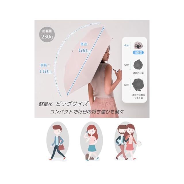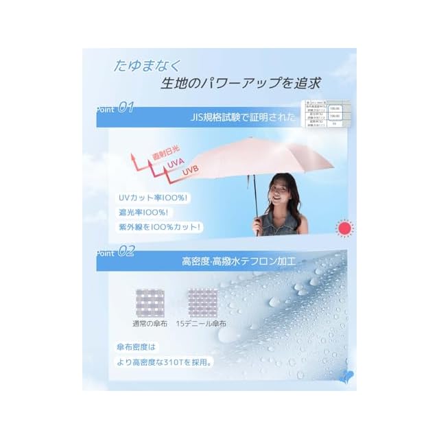 【晴雨兼用&超撥水性】優れた抗水性を備えた310T防水ファブリック生地を採用し、特別な加工により、出色の撥水性能を実現しました。使用後に軽く振るだけで傘が乾きます。また、内側は多層コーティング処理が施されており、紫外線を効果的にカットしますので、日よけとしてもご利用いただけます。