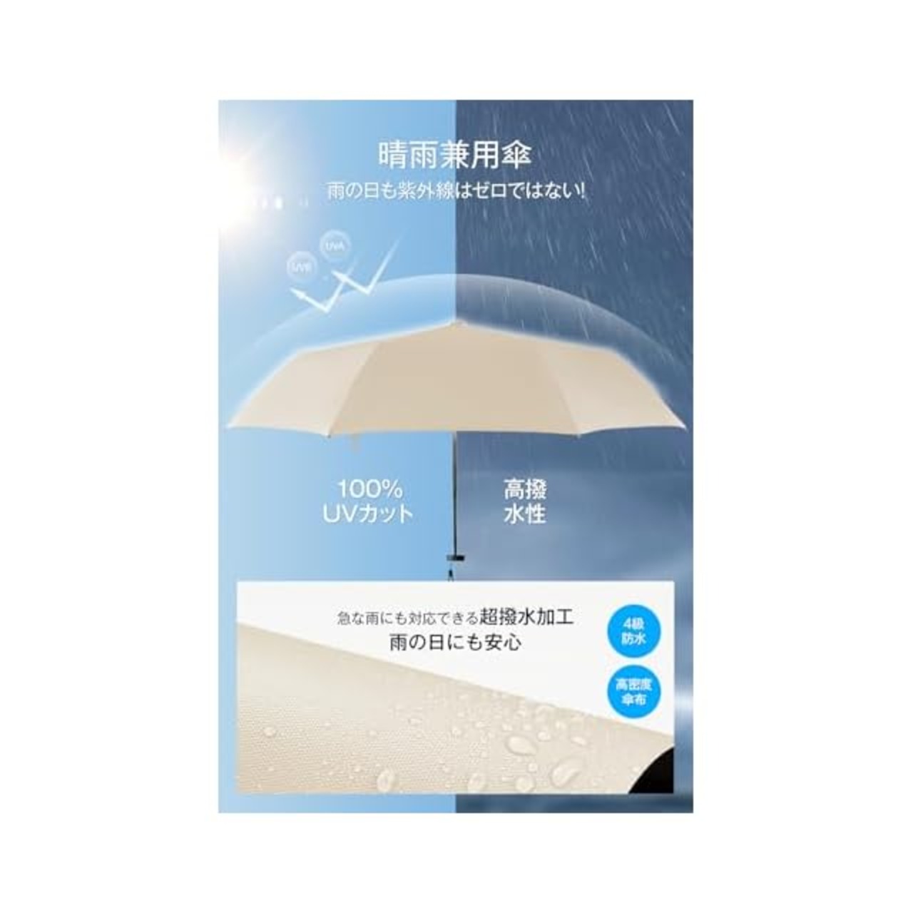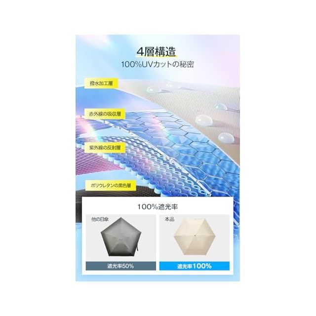 【4層構造 & 日傘兼用雨傘】この日傘は4層構造を採用しています。外側は撥水加工が施され、雨を速やかに弾き、軽量で快適に使用できます。中間層には赤外線吸収と紫外線反射の役割を果たす層があり、UV防護効果が高いです。内部にはブラックゴム複合材料が使われており、一部の紫外線や熱放射を反射し、水や汚れの浸透・付着も防ぎます。そのため手入れも容易です。この構造により、晴れや雨の日において通常の傘よりも高い保護性能を発揮します。