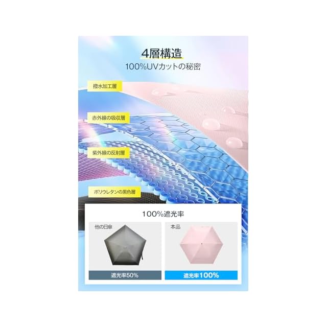 【4層構造 & 日傘兼用雨傘】この日傘は4層構造を採用しています。外側は撥水加工が施され、雨を速やかに弾き、軽量で快適に使用できます。中間層には赤外線吸収と紫外線反射の役割を果たす層があり、UV防護効果が高いです。内部にはブラックゴム複合材料が使われており、一部の紫外線や熱放射を反射し、水や汚れの浸透・付着も防ぎます。そのため手入れも容易です。この構造により、晴れや雨の日において通常の傘よりも高い保護性能を発揮します。