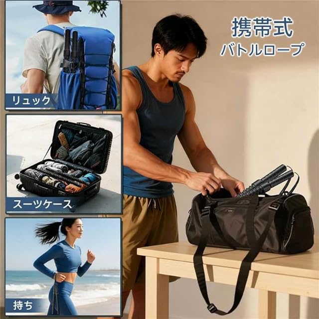 商品名:バトルロープ【2025新設計&マッスル革命】2本 バトルロープ コードレス 携帯型 強力 ロープレスバトルロープ 高効率 自宅用便携式バトルロープ 筋肉の構築エクササイズコードトレ 男女兼用 収納バッグ付き(ブラック)