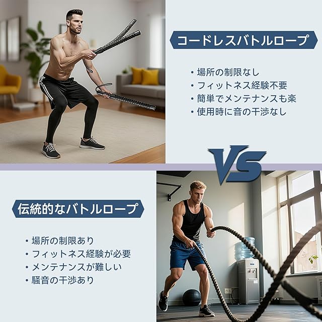 バトルロープ 【2025新設計&マッスル革命】2本 バトルロープ コードレス 携帯型 強力 ロープレスバトルロープ 高効率 自宅用便携式バトルロープ 筋肉の構築エクササイズコードトレ 男女兼用(ブラック)